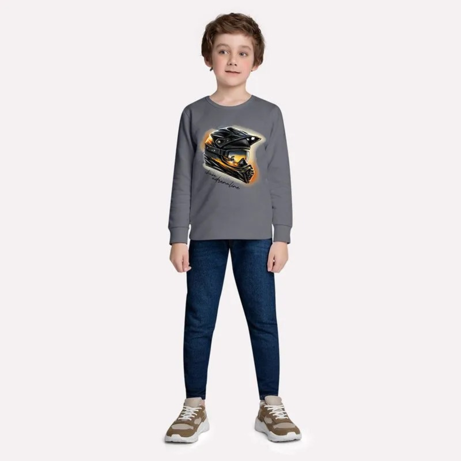 A estampa exclusiva de um capacete de motocross, com detalhes vibrantes em laranja, captura a adrenalina das pistas e traz um visual cheio de atitude. Para completar o estilo, uma frase em lettering, adicionando ainda mais personalidade à peça. Se o seu Kidszinho é fã de aventuras radicais, essa camiseta vai ser a escolha certa para ele arrasar no look!