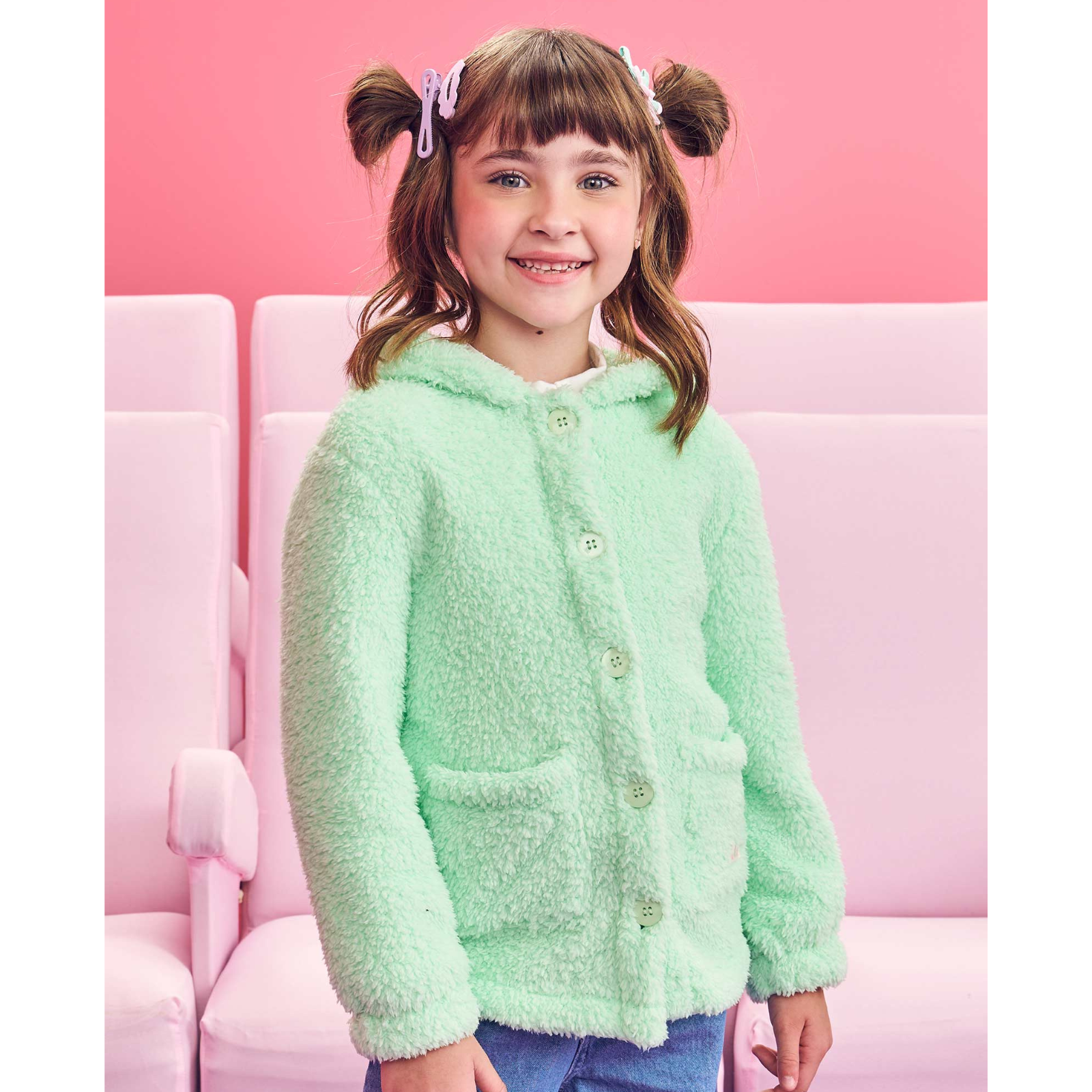 Casaco Teddy em pelo carneirinho manga longa, todo pelúciado deixando assim a peça com um charme a mais, passui gola redonda, estampa lisa, fechamento frontal em botões que facilita na hora de vestir, estampa lisa, possui bolsinhos frontal na parte de baixo e capuz, deixando assim o look mais fofo. Sua Kidszinho estará pronta para arrasar em qualquer ocasião, além de estar linda.