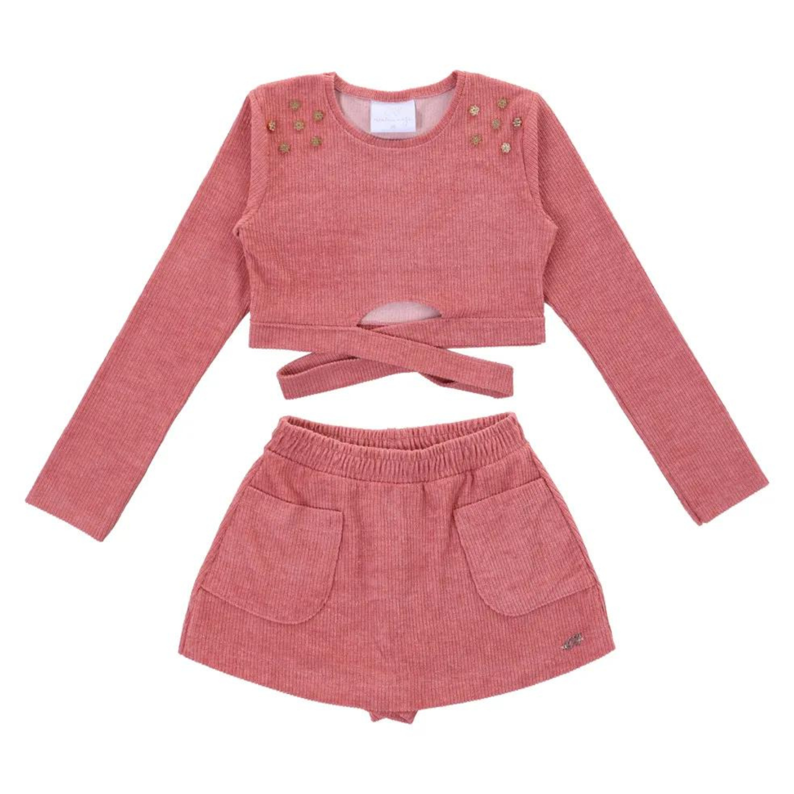 Blusa cropped em cotelê possui mangas longas, decote redondo, estampa lisa e detalhe de abertura transpassado na barra, possui aplique de florzinha com strass nos ombros que da um charme no conjunto, Shorts Saia em cotelê possui bolsos na prate frontal e elástico confortável no cós. Um charme e conforto que sua Kidszinho precisa, garantido assim que sua Kidszinho arrase em qualquer ocasião. Um conjunto que não pode ficar de fora dos looks da sua Kidszinho.