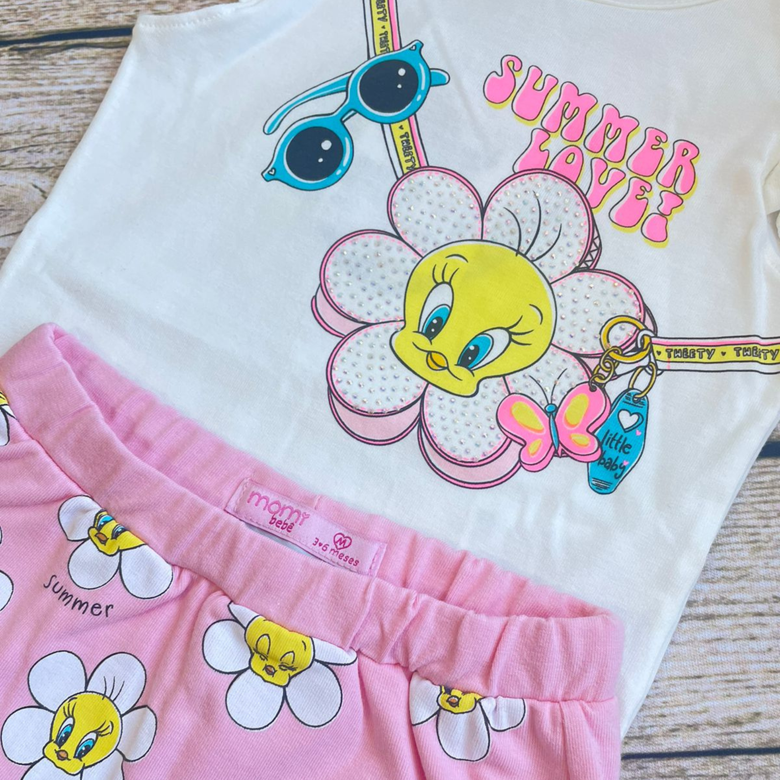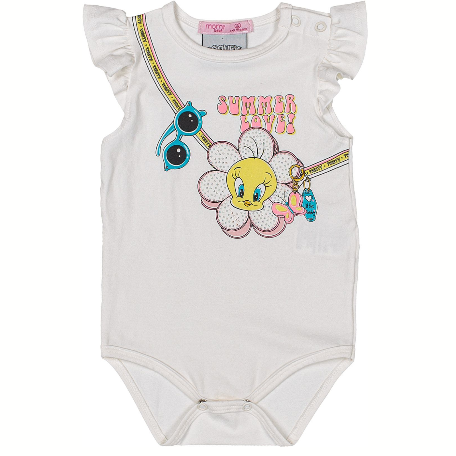 Conjunto Infantil Feminina Momi, composto com body de cotton com estampa alegre e colorida do Piu-Piu (personagem Disney), contém detalhes com apliques em strass, botões de pressão no ombro e entrepernas para facilitar a passagem da cabeça e troca da fralda. O Short-saia é de cotton com estampa do Piu-Piu, etiqueta decorativa na barra, elástico no cós. Como não se apaixonar por esse lookinho super fashion.
