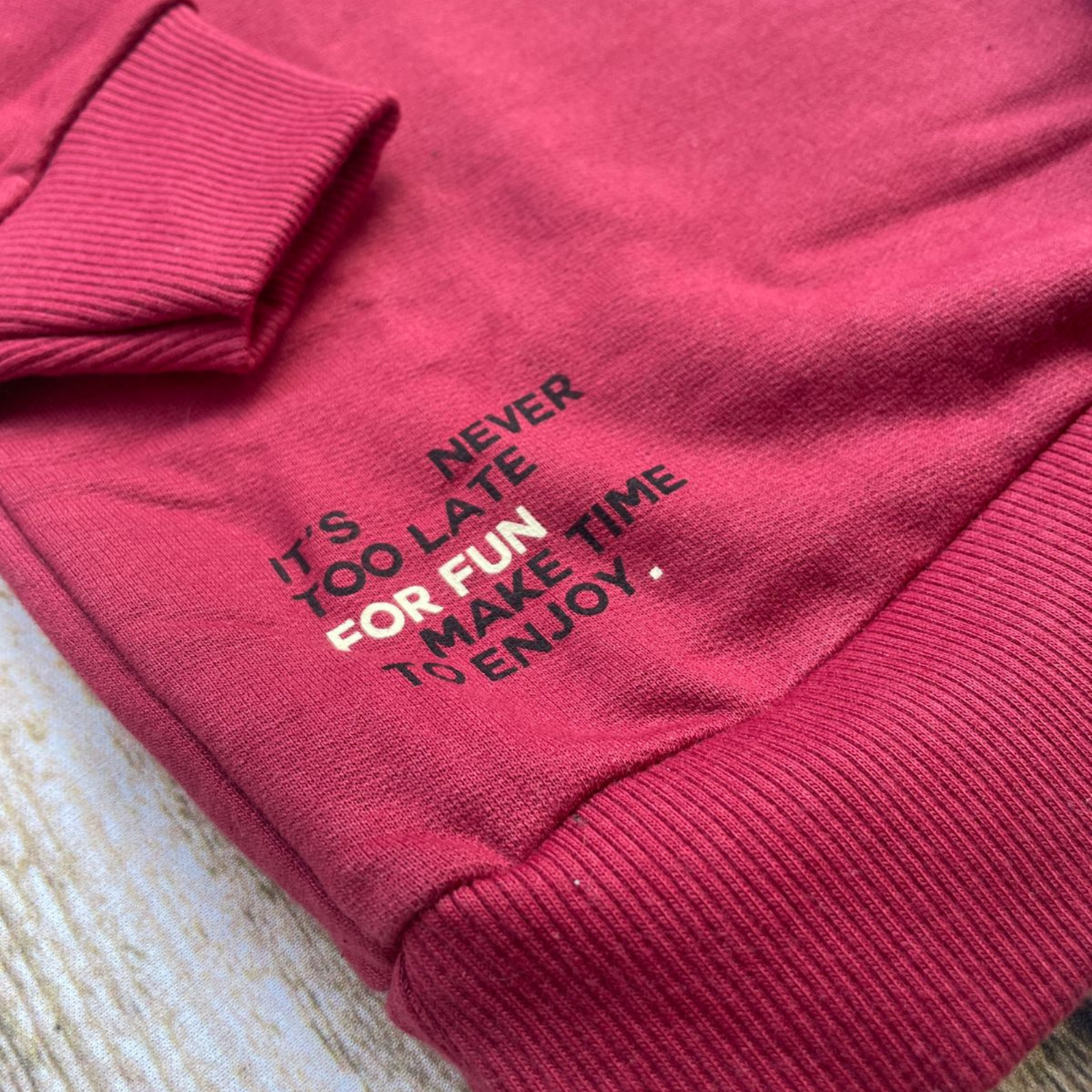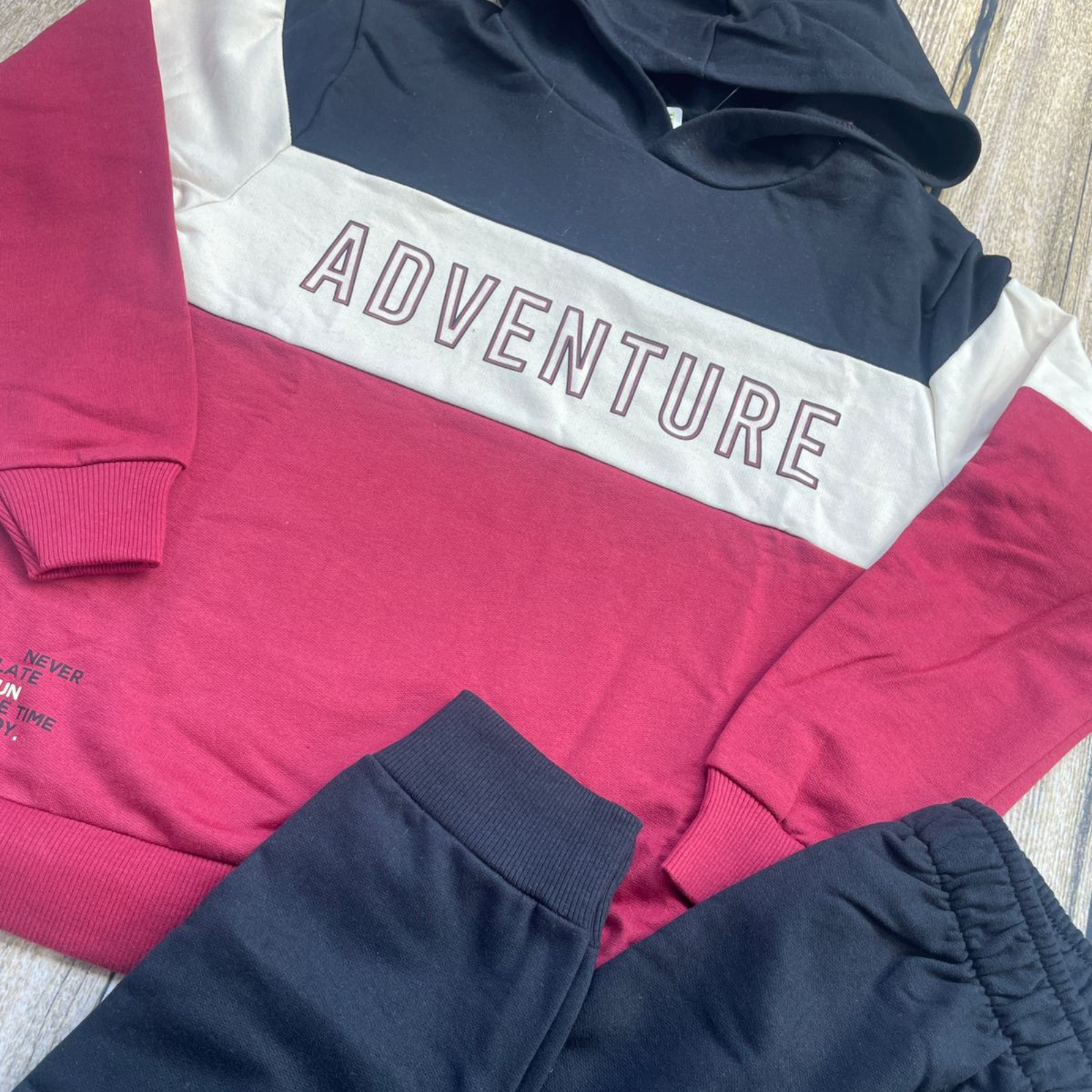 A blusa possui design moderno em cores marcantes preto, bege e vinho com estampa frontal ADVENTURE, transmitindo energia e espírito aventureiro. A calça em moletom preto, com cós elástico e punhos na barra, garante liberdade de movimentos e muito conforto.