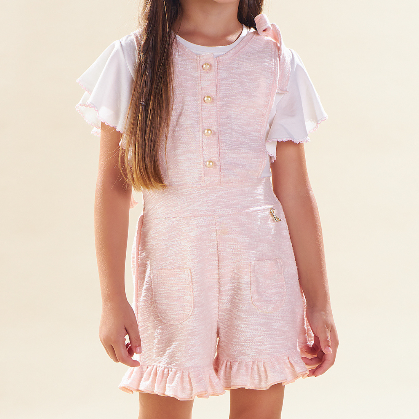 O Blusa infantil em moletinho manga curta com babadinhos e detalhe em bordado em crochê, onde sua Kidszinho vai arrasar. Jardineira em moletinho conta com amarração em laço na altura do ombro, com fechamento de botões de perolas na parte frontal, na parte de baixo conta com bolsinhos na frente e detalhe em pingente da marca e babadinhos na parte de baixo. Um conjunto que não pode ficar de fora dos looks da sua Kidszinho.