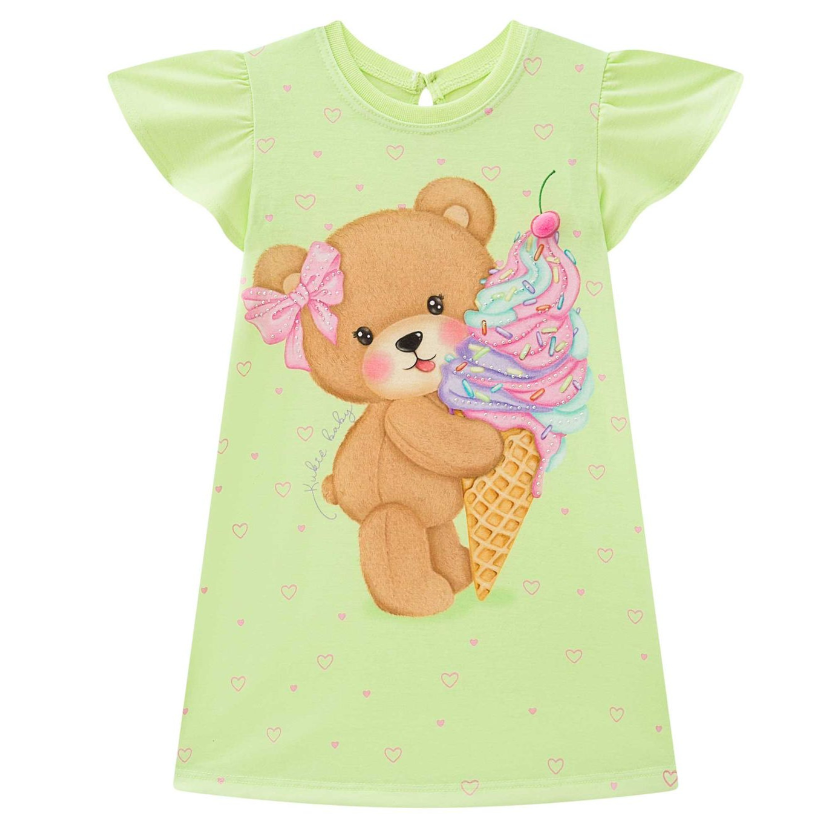 manga curta, modelagem trapézio com abertura na parte de trás com fechamento de botão, possui na parte frontal uma estampa fofa de ursinho com sorteve possui aplique de pompom no sorvete e strass e estampa de corações, onde sua Kidszinho vai arrasar em qualquer ocasião. Um vestido que não pode ficar de fora dos looks da sua Kidszinho.