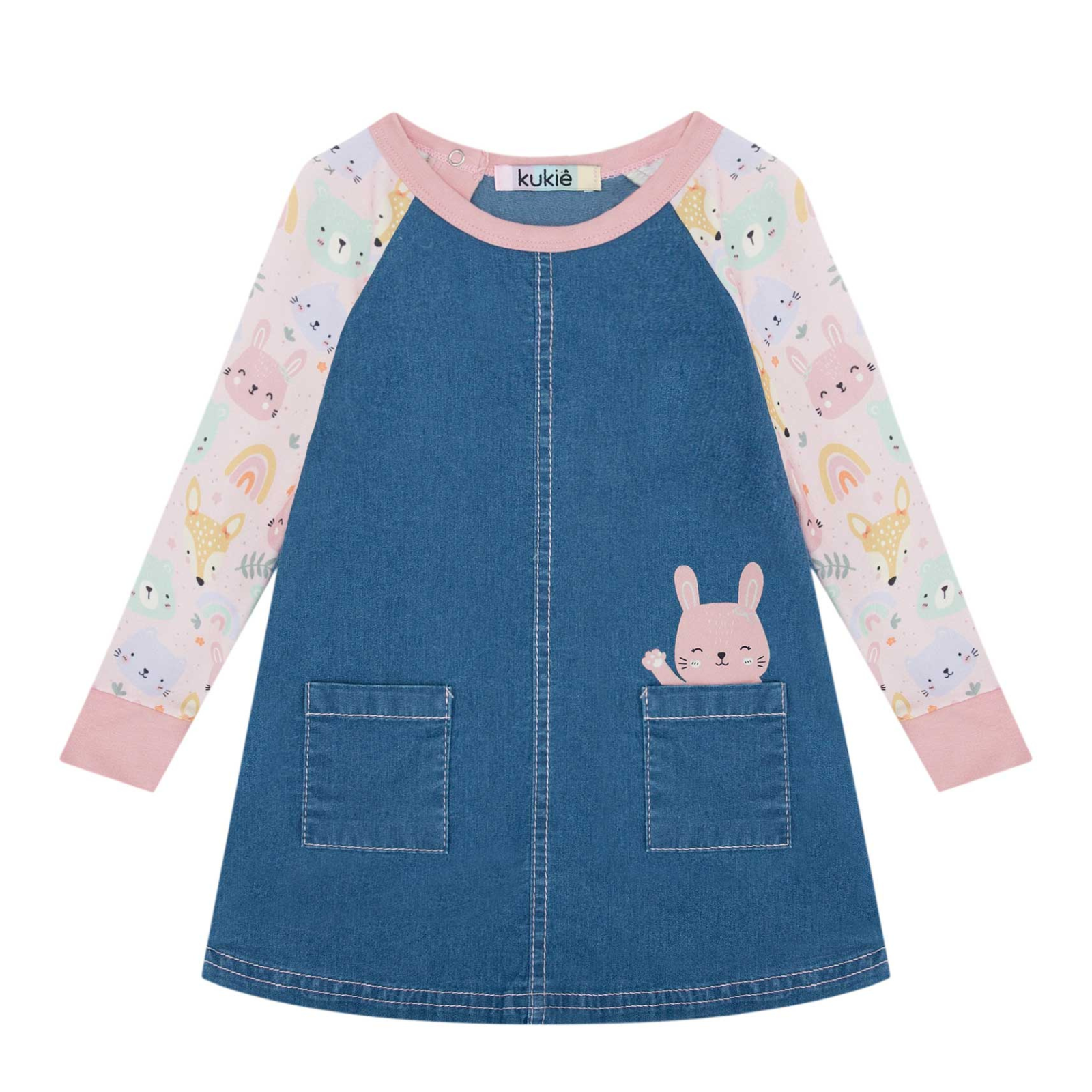 Vestido Infantil Kukiê em jeans liz e molecotton manga longa com estampa em bichinhos bem fofo, bolsinhos frontal com desenho de coelhinho, na parte frontal conta com fechamento de botões de pressão na altura do ombro. Contém em conjunto um par de meias bem fofo com crochê na pater superior. Sua Kidszinho estará pronta para arrasar em qualquer ocasião, além de estar linda. O Vestido Kukiê possui um toque macio e é muito confortável. Com uma qualidade indescritível, o vestido Infantil Kukiê tem todo conforto que sua Kidszinho merece.