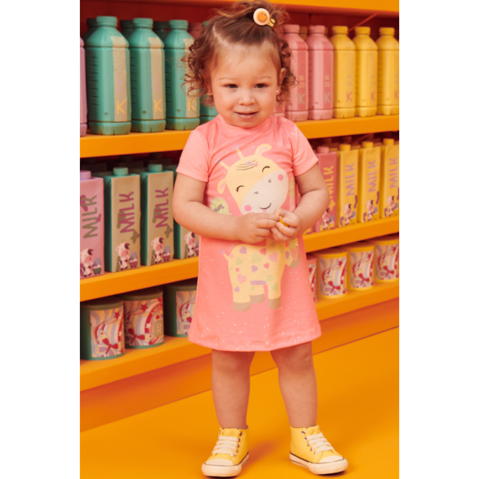 manga curta, modelagem trapézio com abertura no ombro por botões de pressão e estampa fofa de girafinha com strass e granulados coloridos, onde sua Kidszinho vai arrasar em qualquer ocasião. Um vestido que não pode ficar de fora dos looks da sua Kidszinho.